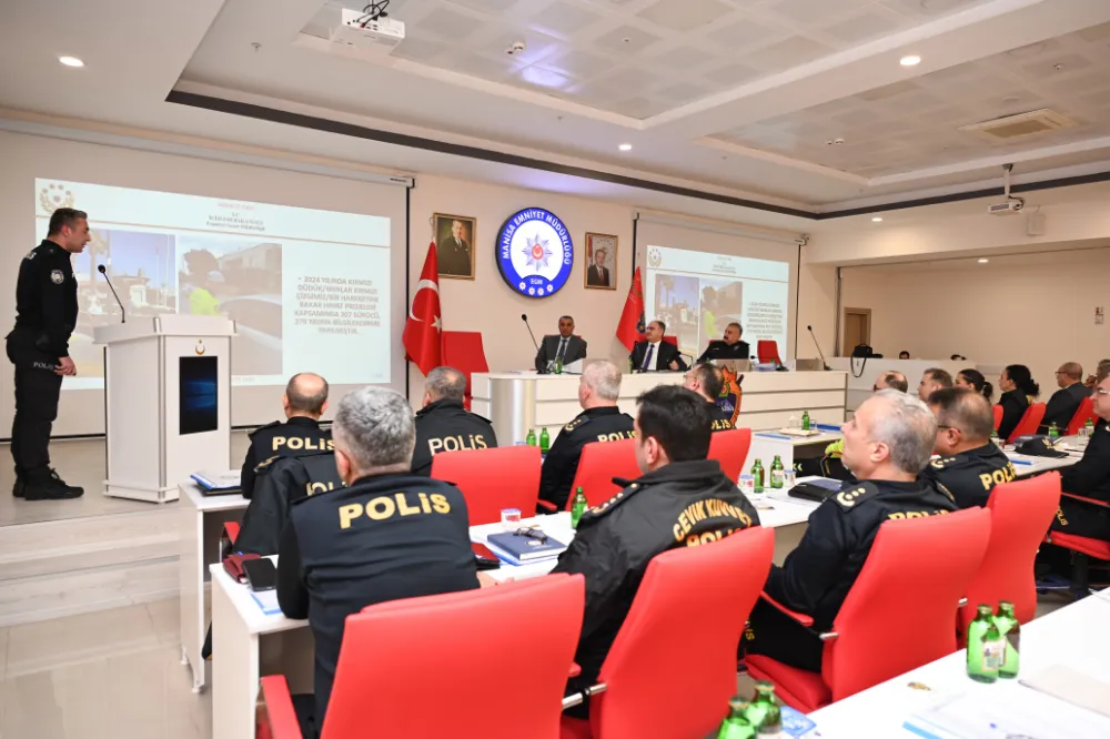 Manisa Emniyet Müdürlüğü’nden yapılan açıklamada şu bilgilere yer verildi: “Valimiz Vahdettin Özkan'ın teşrifleriyle İl Emniyet Müdürümüz Fahri Aktaş, Müdür Yardımcılarımız, Şube Müdürlerimiz ve İlçe Emniyet Müdürlerimizle yerleşkemizde “2024 Yılı Değerlendirme Toplantısı” gerçekleştirildi.”