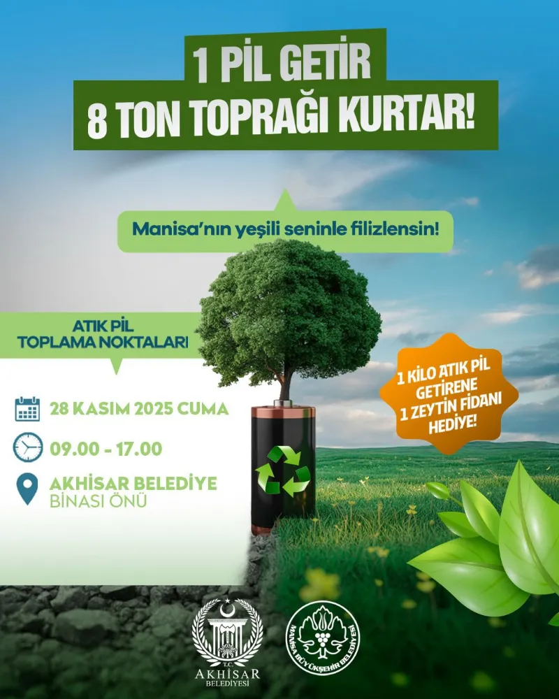 Akhisar Belediyesi, Manisa Büyükşehir Belediyesi iş birliğiyle çevre bilincini artırmak amacıyla “1 Pil Getir, 8 Ton Toprağı Kurtar” kampanyasını başlatıyor.