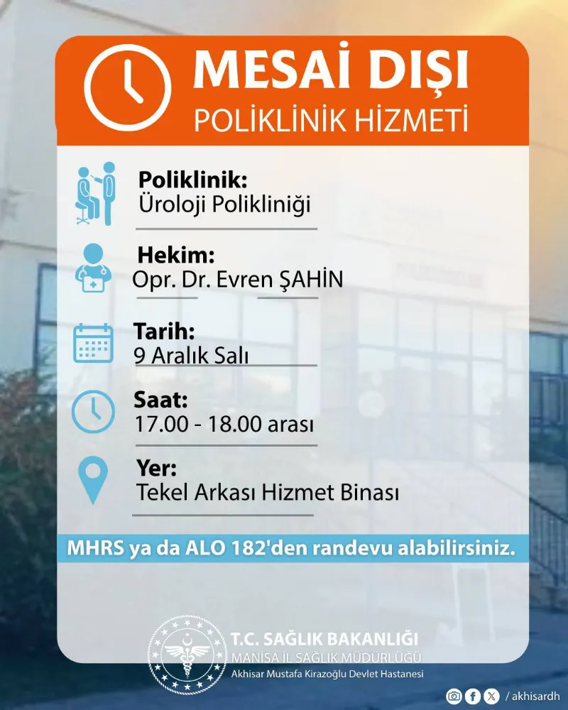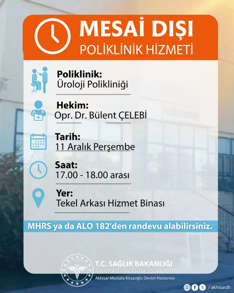 Her güne ait hekim, branş ve saat bilgileri hazırlanan görsellerde ayrıntılı şekilde paylaşıldı. Muayene olmak isteyen vatandaşlar, randevularını MHRS üzerinden veya ALO 182 çağrı hattını arayarak oluşturabilecek. Hastane yönetimi, halkın erişilebilir sağlık hizmetlerine daha rahat ulaşmasını sağlamak amacıyla mesai dışı poliklinik uygulamasının sürdüğünü belirterek, “Sağlığınız için buradayız.” mesajını paylaştı.