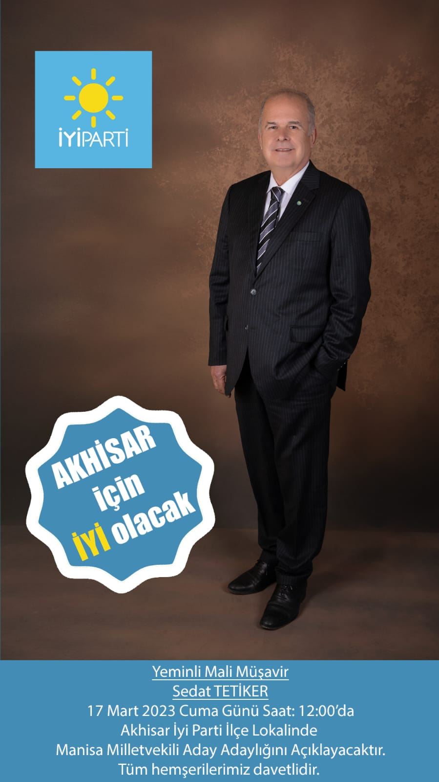 Yeminli Mali Müşavir Sedat Tetiker, 17 Mart 2023 Cuma günü saat 12.00'de Akhisar İyi Parti İlçe Lokalinde Manisa Milletvekili aday adaylığını açıklayacak.