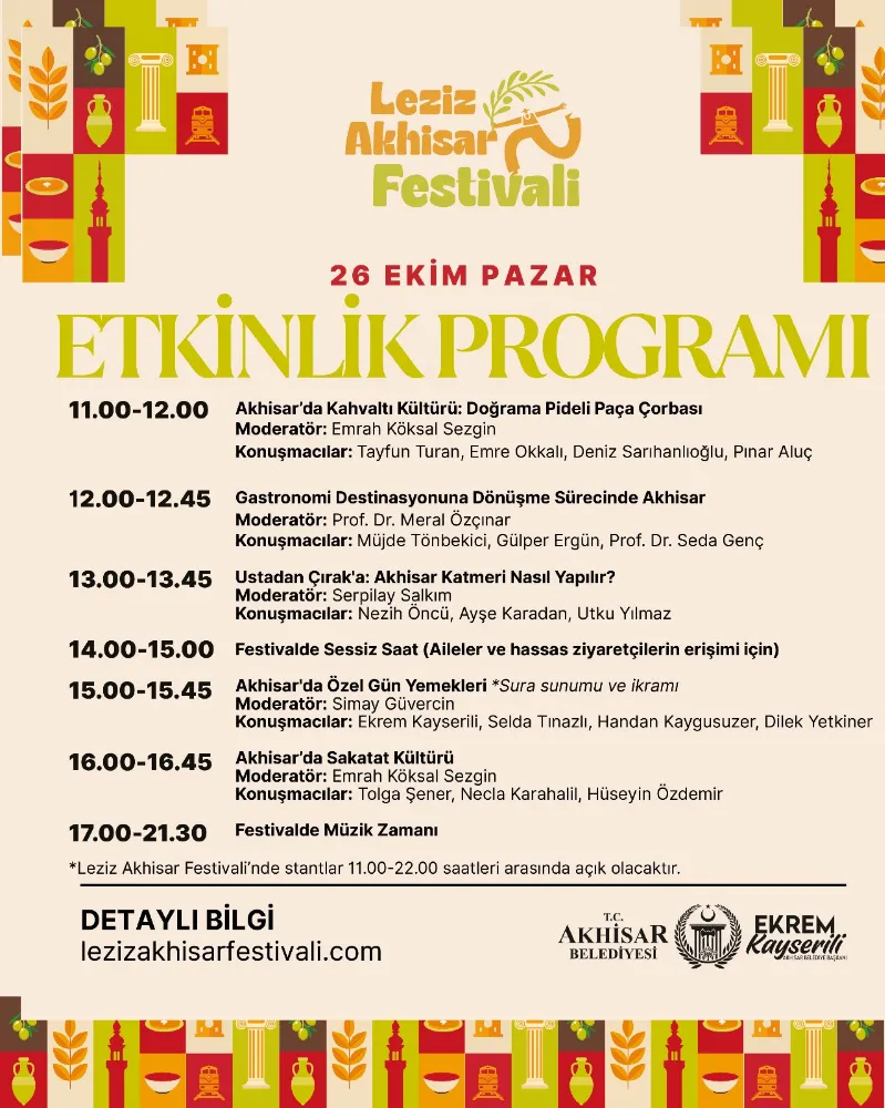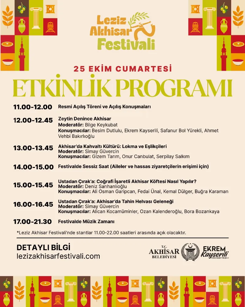 Açılış söyleşisinin ardından festival boyunca, gastronomi, yöresel lezzetler ve Akhisar mutfağı üzerine birçok farklı isim tarafından düzenlenecek etkinlik ve söyleşilerle program zenginleşmeye devam edecek.