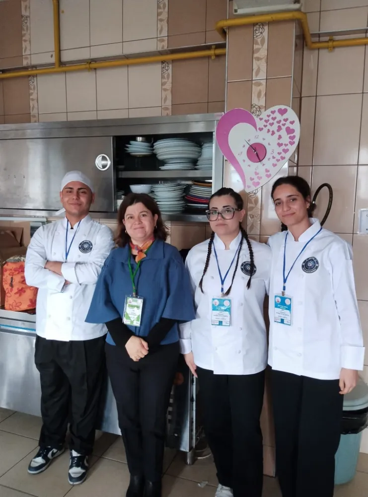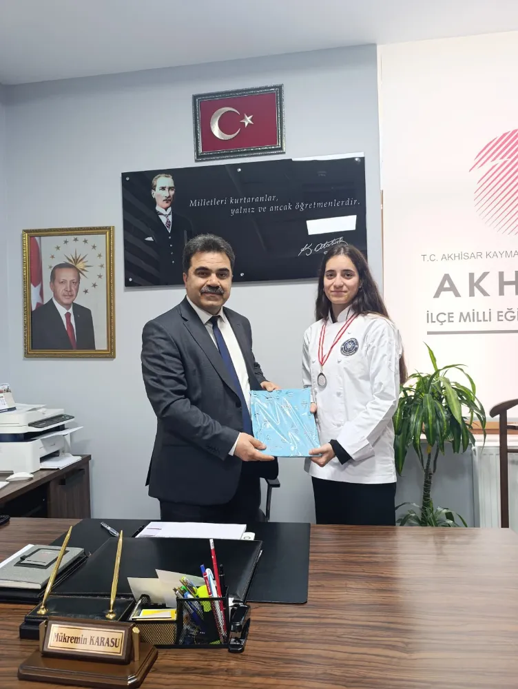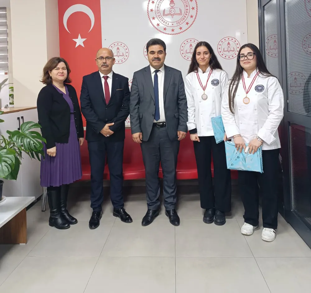 Mesleki Eğitim Merkezi Müdürü Gökhan Akça, Yiyecek ve İçecek Alanı Öğretmeni Fatma Yüksel ve yarışmada başarı elde eden genç şefler Hasan Ali Can Verili, Reyyan Çaka ve Azra Çelebi, bu anlamlı başarıyı Müdür Mükremin Karasu ile paylaştı.