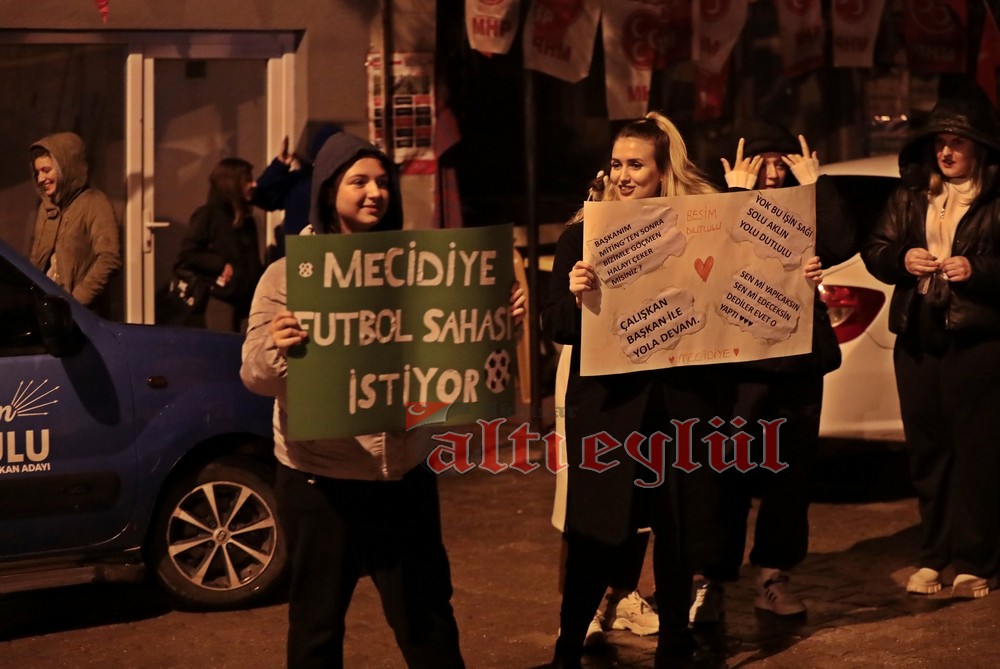 İkinci dönemlerinde Mecidiye’nin futbol sahası ve yeni düğün salonu ihtiyaçlarını karşılama sözü veren Başkan Dutlulu, konuşmasını şöyle sürdürdü; “Öncelikle beni her zaman olduğu gibi büyük bir destekle karşılayan Mecidiye halkımıza selam ve sevgilerimi iletiyorum. Biz 5 yıl boyunca çok çalıştık; ama hizmetlerimizi kapalı kapılar ardında kimseye sormadan hayata geçirmedik. Buraya geldik ve Mecidiye halkına sorduk. Asfalt dediler, asfalt attık. Durak istediler, durak yaptık. Park istediler, en güzelini yaptık. Kaldırım istediniz kaldırım yaptık. Halkımızın nerede ne ihtiyacı varsa onu yaptık.