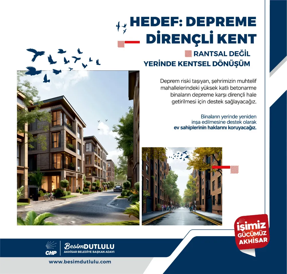 Başkan Dutlulu, şöyle konuştu; “Rantsal değil, yerinde kentsel dönüşüm yapacağız. Deprem riski taşıyan, şehrimizin muhtelif mahallelerindeki yüksek katlı betonarme binaların depreme karşı dirençli hale getirilmesi için destek sağlayacağız. Binaların yerinde ve yeniden inşa edilmesinde destek olarak ev sahiplerinin haklarını koruyacağız” dedi.