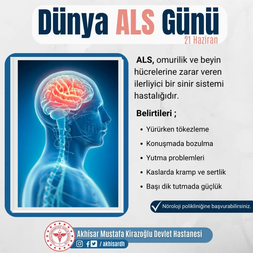 21 Haziran Dünya Amyotrofik lateral skleroz (ALS),günü dolayısıyla Akhisar Mustafa Kirazoğlu Devlet Hastanesi bilgi notu yayımladı. Yayımlanan bilgi notunda ALS’ye dair bilgiler paylaşıldı. Amyotrofik lateral skleroz (ALS), omurilik ve beyin hücrelerine zarar veren ilerleyici bir sinir sistemi hastalığıdır.