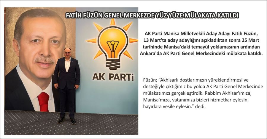 AK Parti Manisa Milletvekili Aday Adayı Fatih Füzün, 13 Mart’ta aday adaylığını açıkladıktan sonra 25 Mart tarihinde Manisa’daki temayül yoklamasının ardından Ankara’da AK Parti Genel Merkezindeki mülakata katıldı.