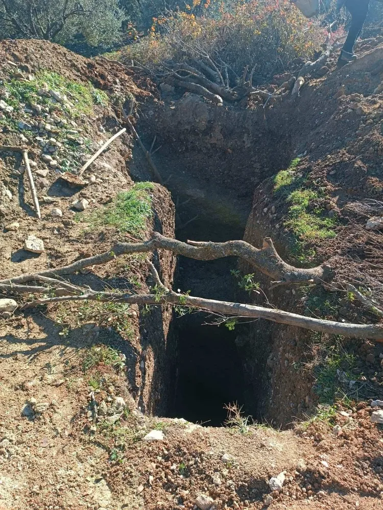 Olay yerinde yapılan incelemede yaklaşık 5 metre derinliğinde kazı yapıldığı tespit edilirken, kaçak kazıda kullanılan çeşitli suç aletlerine el konuldu.