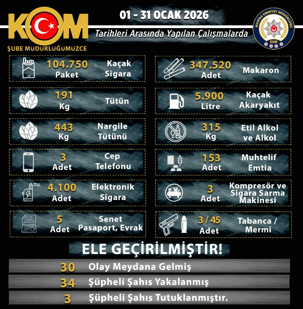 Manisa İl Emniyet Müdürlüğü Kaçakçılık ve Organize Suçlarla Mücadele Şube Müdürlüğü ekipleri, 01-31 Ocak 2026 tarihleri arasında il genelinde kaçakçılık, mali ve ekonomik suçlar ile organize suç örgütlerine yönelik kapsamlı çalışmaları paylaştı. Yapılan denetimler ve operasyonlar sonucunda 30 olay meydana gelirken, 34 şüpheli yakalandı ve 3 kişi tutuklandı.