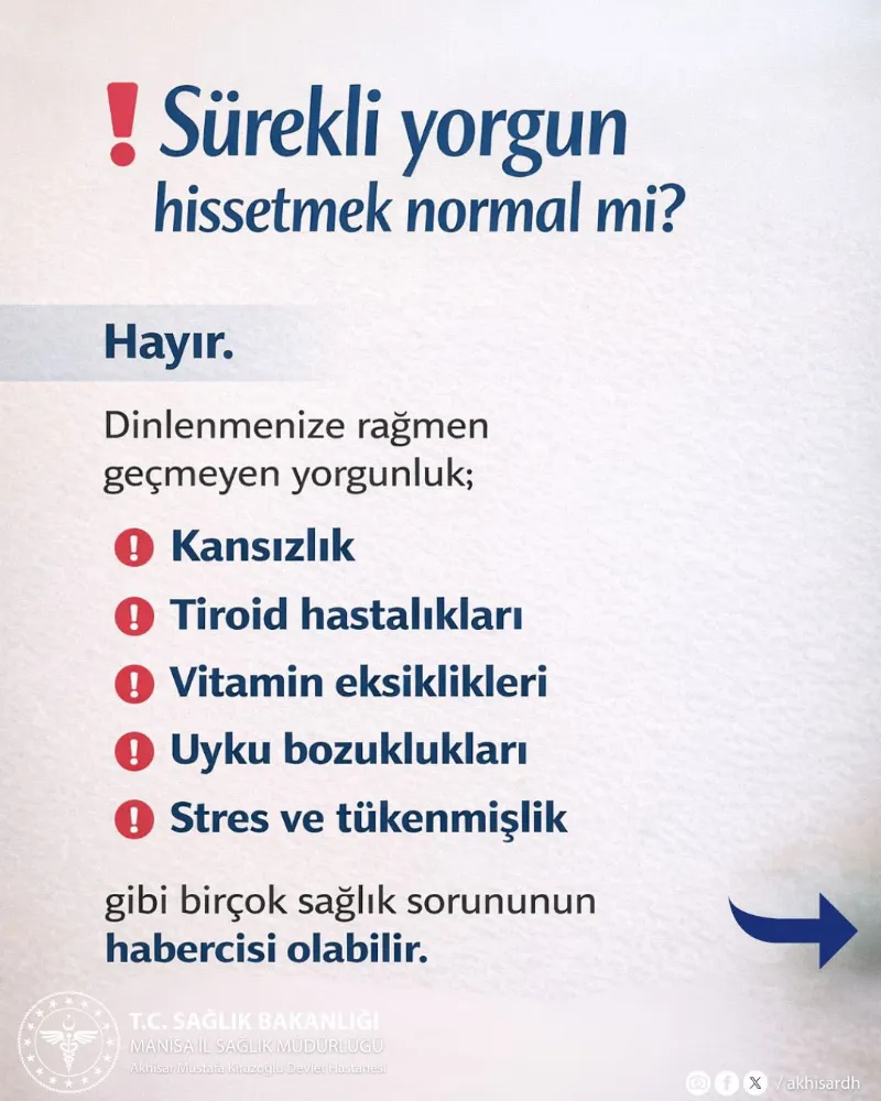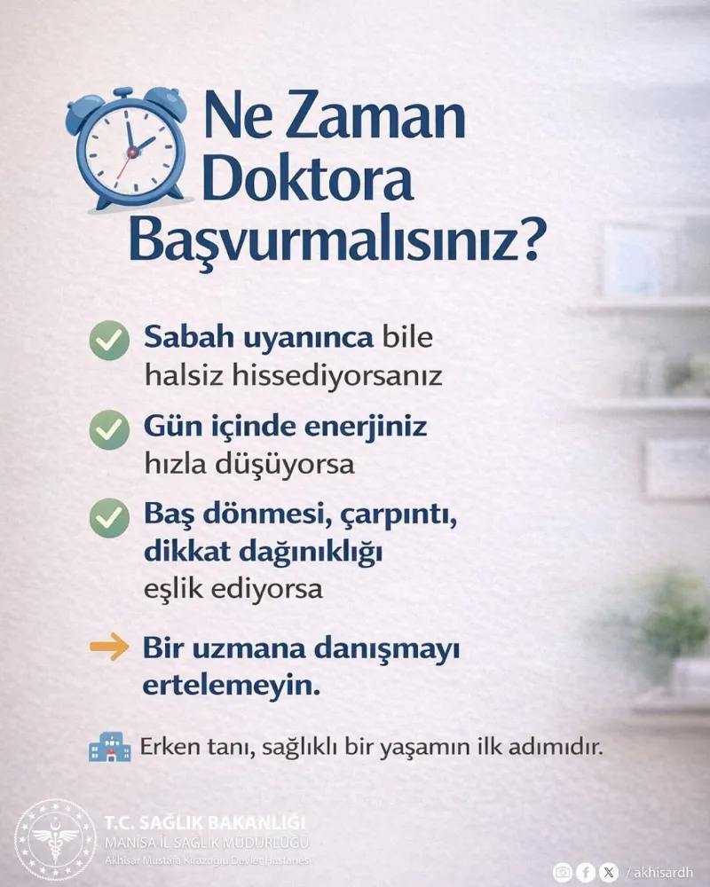 Akhisar Mustafa Kirazoğlu Devlet Hastanesi, toplumda sıkça göz ardı edilen sürekli yorgunluk hissine karşı vatandaşları uyardı. Uzmanlar, dinlenmeye rağmen geçmeyen halsizliğin basit bir durum olarak değerlendirilmemesi gerektiğini belirtti.