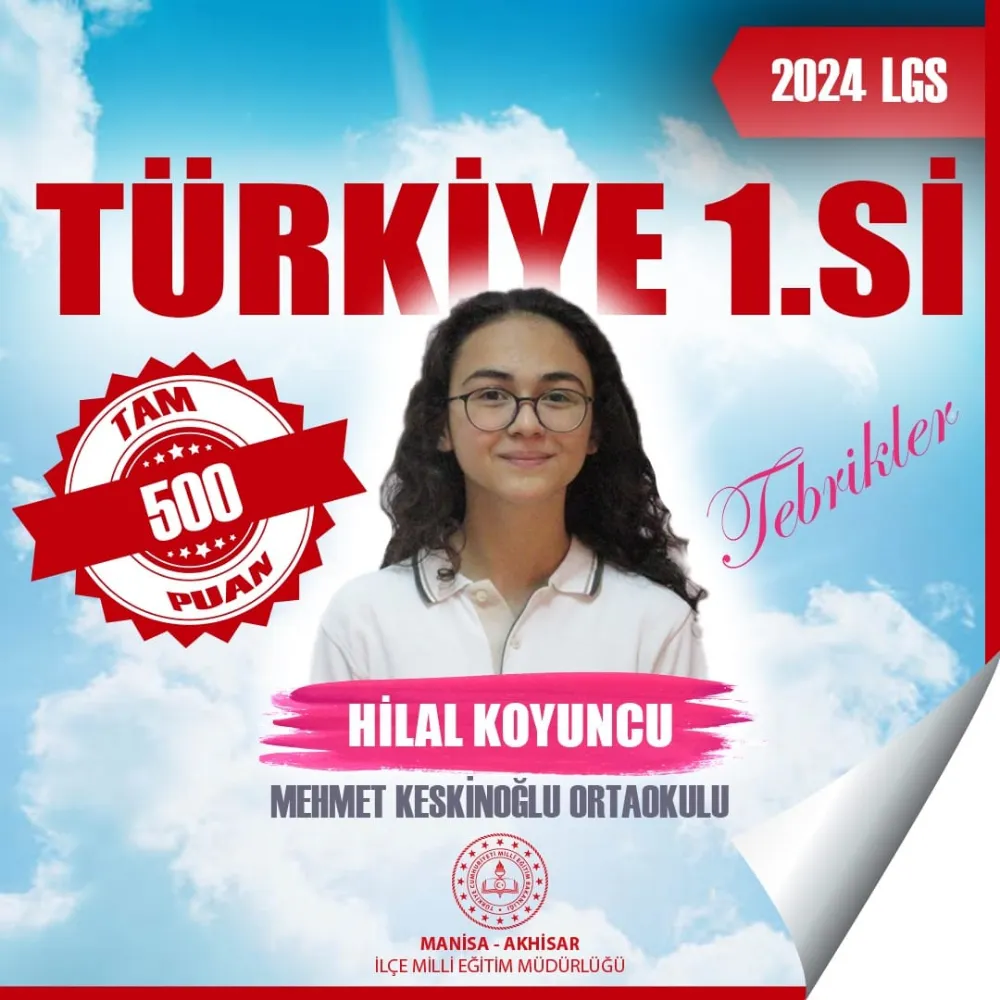 02 Haziran 2024 tarihinde başarıyla uygulanan LGS kapsamındaki sınav sonuçları açıklandı. 1 milyon 38 bin 544 öğrencinin başvurduğu LGS kapsamındaki merkezi sınavda, 352 öğrenci 500 tam puan aldı. Akhisar’da 1.839 öğrencinin katıldığı LGS sınavında, Mehmet Keskinoğlu Ortaokulu öğrencisi Hilal Koyuncu, tüm soruları doğru yanıtlayarak 500 tam puan aldı ve Türkiye 1.’si oldu. Tercih süreci sonrasında yerleştirme sonuçları ise 22 Temmuz'da açıklanacak.
