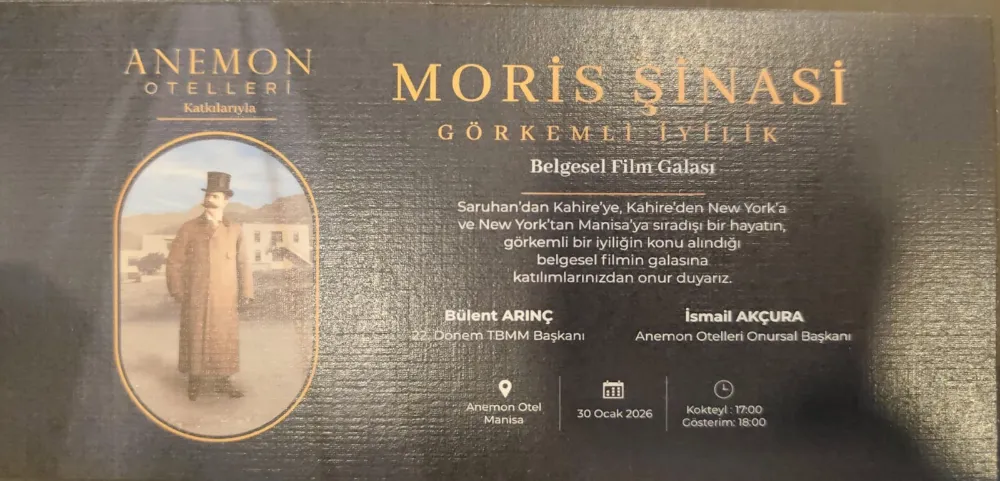 Moris Şinasi: Görkemli İyilik” adını taşıyan belgeselin gala gösterimi Manisa’da gerçekleştirilecek. Gala programına, Türkiye Büyük Millet Meclisi eski Başkanı Bülent Arınç başta olmak üzere çok sayıda davetlinin katılması bekleniyor.