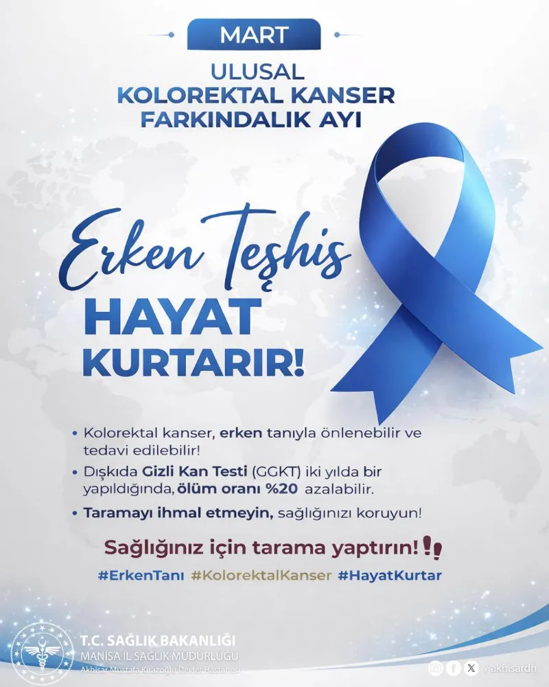 Akhisar Mustafa Kirazoğlu Devlet Hastanesi, Mart ayının Ulusal Kolorektal Kanser Farkındalık Ayı olduğunu hatırlatarak, vatandaşları erken teşhis ve tarama konusunda uyardı.