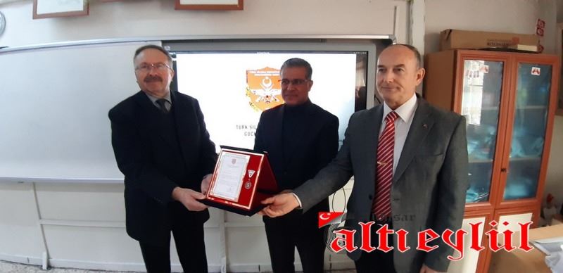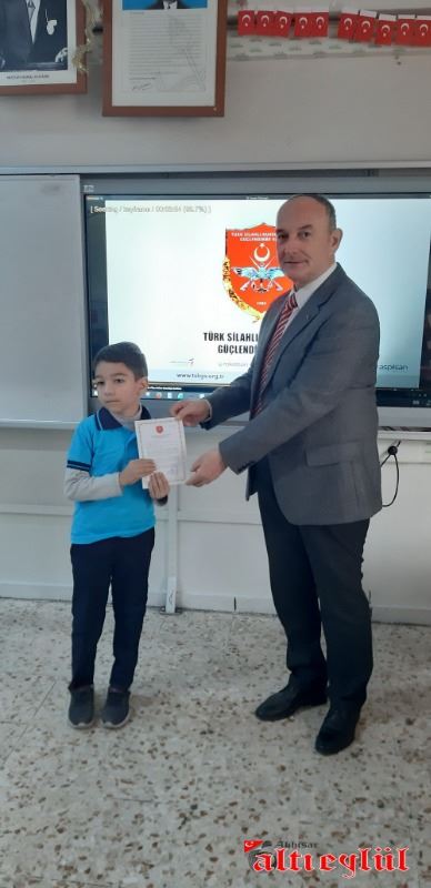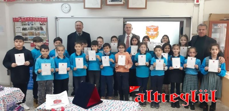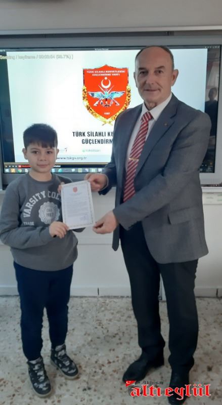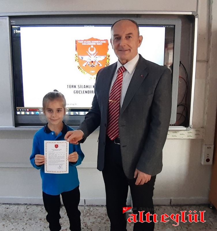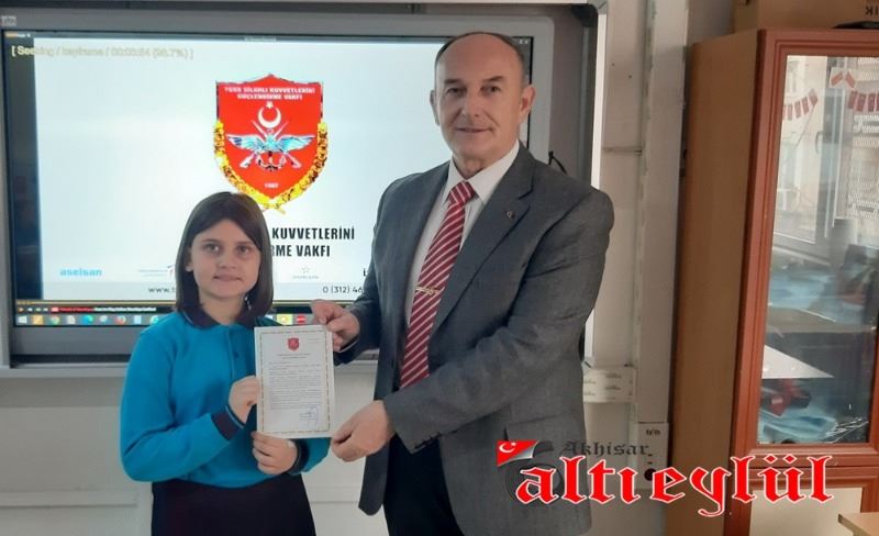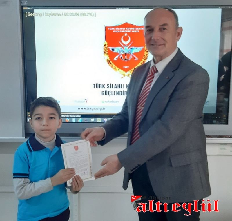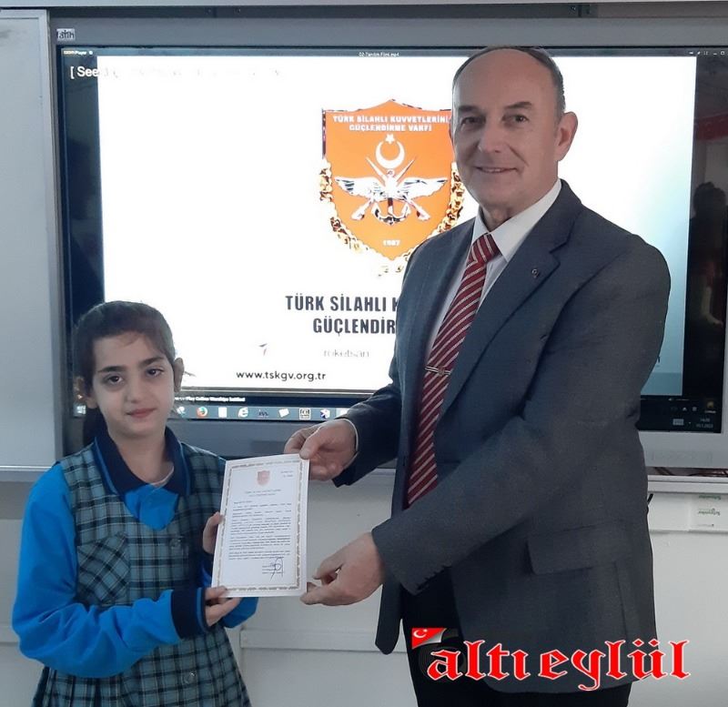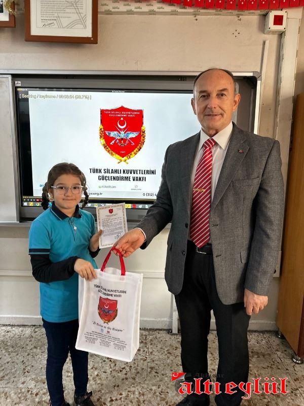 Türk Silahlı Kuvvetlerini Güçlendirme Vakfı Genel Müdürlüğü tarafından düzenlenerek gönderilen Bronz Madalya ve Berat Belgesini 3-F Sınıfı adına Sınıf Öğretmeni Ahmet Samim Tatar’a takdim eden Türk Silahlı Kuvvetlerini Güçlendirme Vakfı İzmir Bölge Temsilcisi Emekli Albay Gültekin Aşer, vakfa yaptıkları bağıştan dolayı teşekkür etti.