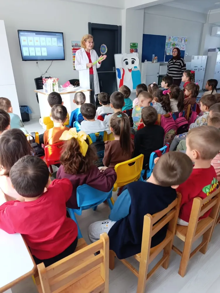 Akhisar İlçe Sağlık Müdürlüğü görevlileri tarafından gerçekleştirilen eğitimde, çocuklara diş bakımının önemi anlatıldı ve doğru diş fırçalama teknikleri uygulamalı olarak gösterildi.