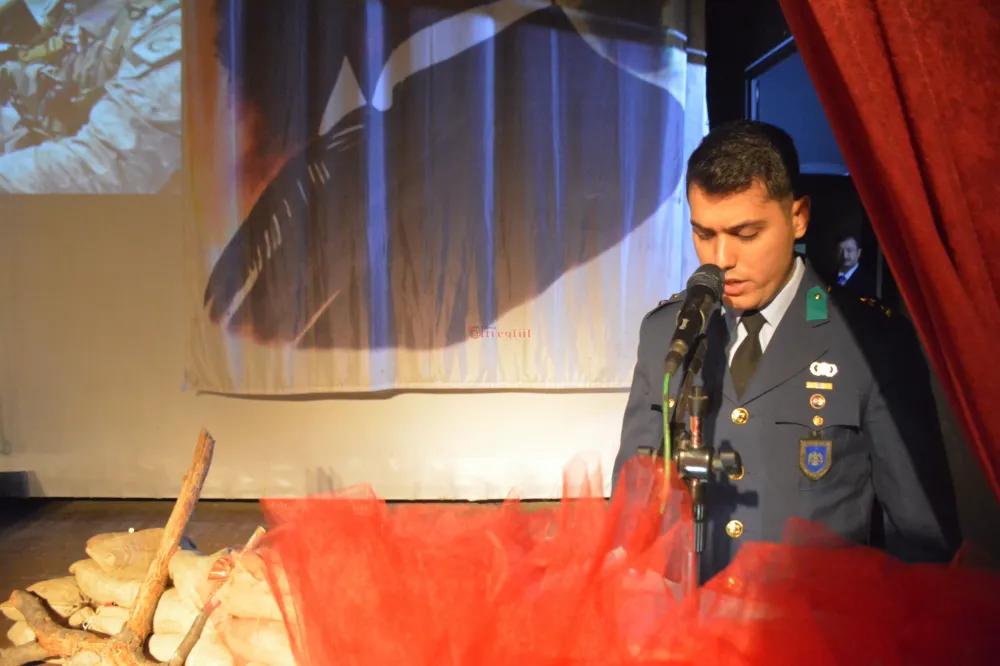 Günün anlam ve önemine yönelik konuşma Hava Piyade Üsteğmen İsmail Zülü tarafından gerçekleştirildi. Üsteğmen İsmail Zülü; “Bugün, bağımsızlığımızın timsali, milletimizin vatanı uğruna sergilediği fedakârlığın ve kahramanlığın bir destanı olan Çanakkale Zaferi'nin 109’uncu yıldönümünün gururunu ve aziz şehitlerimize karşı olan vefa görevimizi yerine getirmenin onurunu bir kez daha yaşıyoruz. Ayrıca bugün, siperler arasındaki mesafenin sadece birkaç metre ve ölümün kaçınılmaz olduğu bir muharebede, öleni görüp kısa bir süre sonra kendisinin de öleceğini bildiği halde en ufak bir duraksama göstermeden, yılmadan savaşarak milletimizin yüzyıllardır sarsılmış özgüven duygusunu yeniden kuvvetlendiren Çanakkale ruhunun oluştuğu gündür. Türk tarihinin dönüm noktalarından birini oluşturan Çanakkale savaşı; yalnız Türk tarihinin değil, aynı zamanda dünya tarihinin de önemli cephelerinden birisi olmuştur. Türk askerinin, erinden en üst komutanına kadar savaşın her safhasında gösterdiği dillere destan başarısı, milletimizin kahramanlığı, azmi, iradesi, cesareti ve vatan sevgisinin yanı sıra, harp sahasında düşmanından bile esirgemediği merhameti ve şefkati tüm insanlığa örnek olmuştur. Çanakkale savaşları; bir varlık mücadelesi, bir kahramanlık abidesi olarak tarihteki şanlı yerini almıştır. Yine bu zafer, ebedi Başkomutan Gazi Mustafa Kemal Atatürk gibi bir askeri dehanın tarih sahnesine çıkmasına vesile olmuştur. Vatanı ve İstiklali için hiçbir fedakârlıktan kaçınmayan aziz Türk milletinin albayrağa sarılı kınalı evlatları, Çanakkale ve Kurtuluş savaşında olduğu gibi; 1950 yılında güney Kore’de, 1974 yılında ise Kıbrıs Barış harekâtında Kıbrıslı Türk kardeşlerinin canlarına ve namuslarına olan düşmanca saldırının bertaraf edilmesinde etkin rol oynamıştır. Türkiye Cumhuriyetinin bekasını sağlamak maksadıyla 1984 yılından bu yana iç güvenlik harekât bölgesinde sınır ötesi operasyonlarda ve 15 Temmuz'da, bölücü terör örgütü mensuplarına karşı mücadele sürdürülmüş ve sürdürülmeye devam etmektedir.