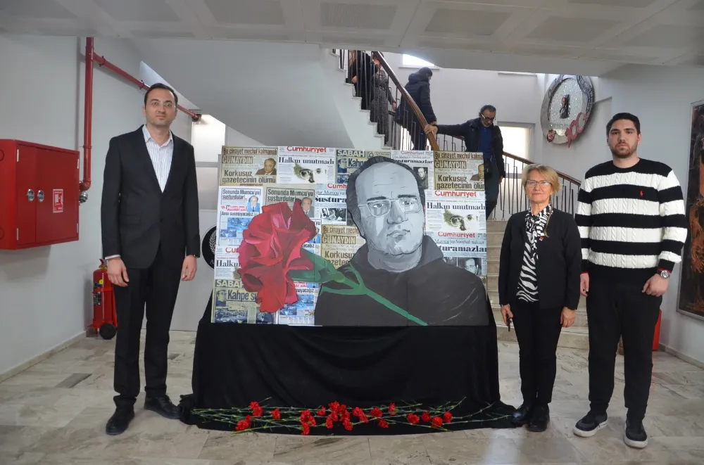 Etkinlik sonrası, Kültür Merkezinin girişinde yer alan ve Resim Öğretmeni İpek Berşan Arabacıoğlu tarafından yapılan büyük tablo, konukların yoğun ilgisini çekti. Katılımcılar, tablo önünde fotoğraf çektirmek için sıraya girdi. Ayrıca, Uğur Mumcu’nun gazetecilik yaşamını ve suikasta uğrayışını konu alan bir resim sergisi de ziyaret edildi.